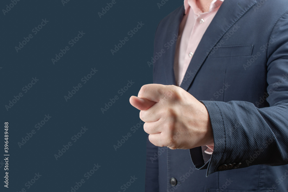 businessman shows fig gesture. . Businessman in a blue suit shows a fig sign on blue background. gesture of contempt or rejection