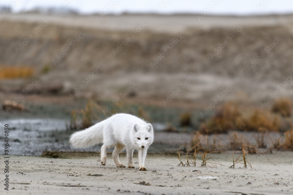 Arctic fox (Vulpes Lagopus) in wilde tundra. Arctic fox on the beach.