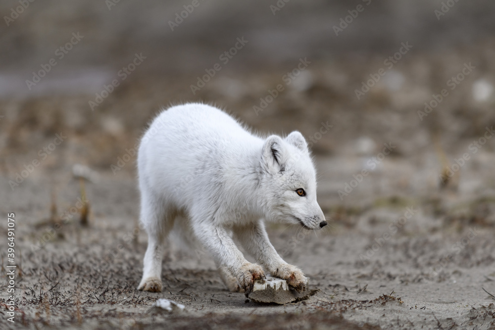 Arctic fox (Vulpes Lagopus) in wilde tundra. Arctic fox on the beach.