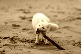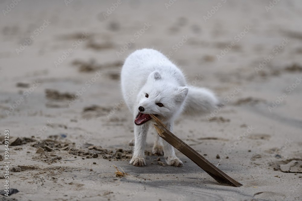 Arctic fox (Vulpes Lagopus) in wilde tundra. Arctic fox playing with wood.