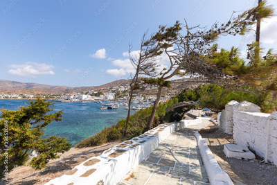 Boat moored in the bay. Chora, Ios Island, Greece.
