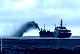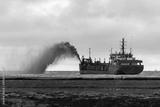 Vessel engaged in dredging. Dredger working at sea. Ship excavating material from a water environment.