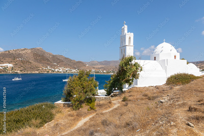 View of the Agia Irini, Saint Irene, Greek Orthodox church, Chora, Ios Island, Greece.