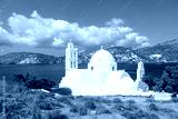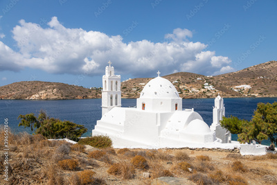 View of the Agia Irini, Saint Irene, Greek Orthodox church, Chora, Ios Island, Greece.