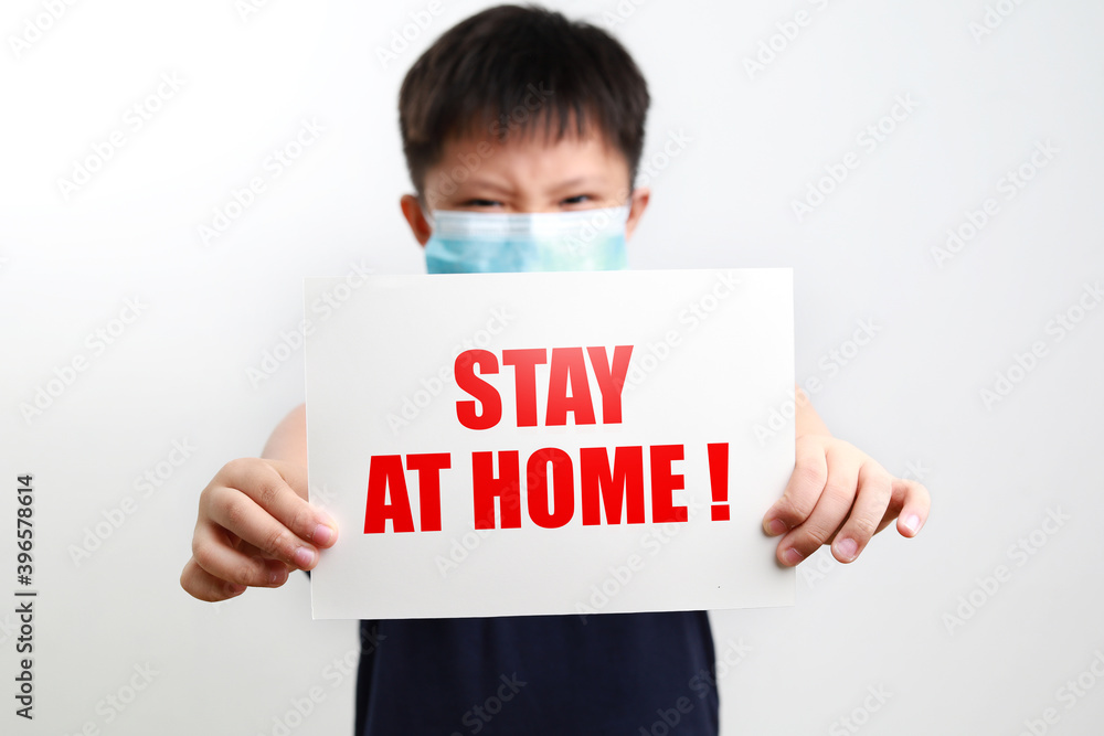Portrait of a 9-year-old Asian boy wearing a protective mask and holding a paper card with text "Stay At Home!"