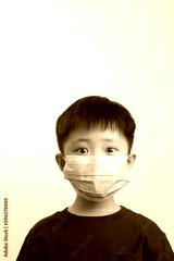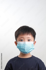 Portrait of 9-year-old boy wearing a protective mask against a white background. Coronavirus, Covid-19 and pandemic concept.