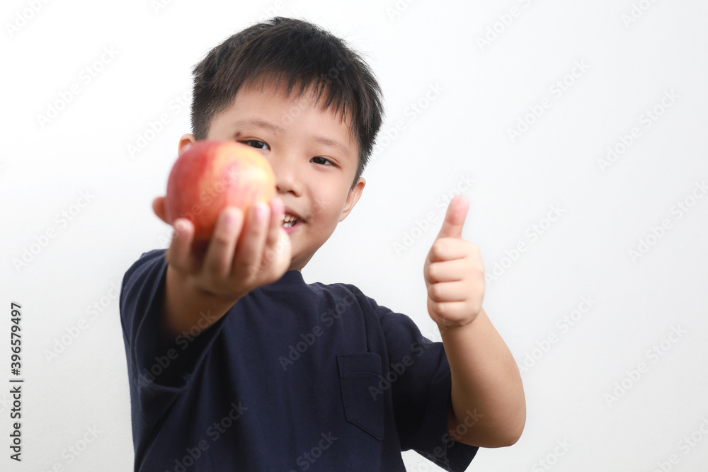 Portrait of a 9-year-old Asian Boy eating apple against a white background