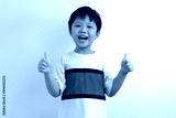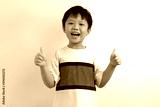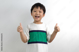 Cute little Asian boy showing thumbs up against a white background