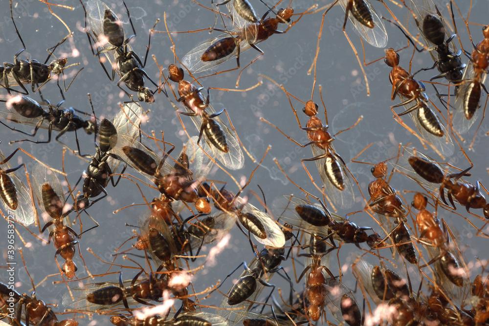 Close up a mass of flying ants on a glass window after heavy rain.