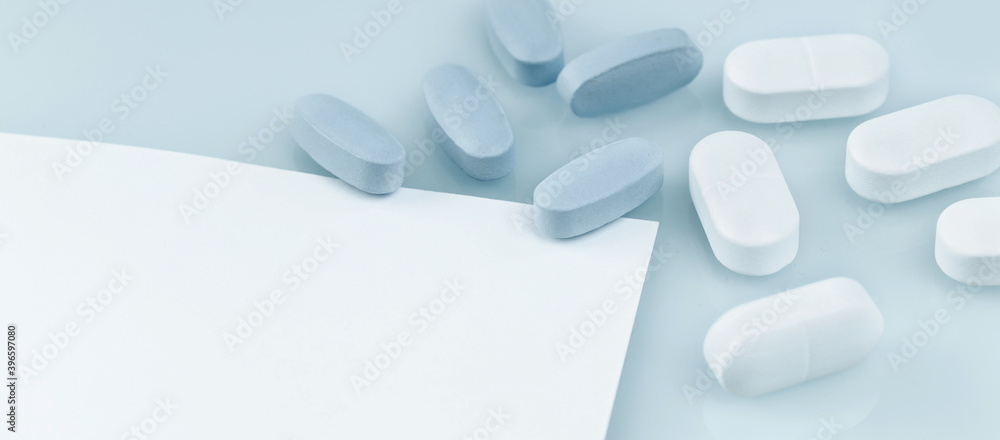 Medical banner. many white and blue capsule tablets or pills on the table. Close up notice copy space. Healthcare pharmacy and medicine concept. Painkillers or prescription drugs consumption