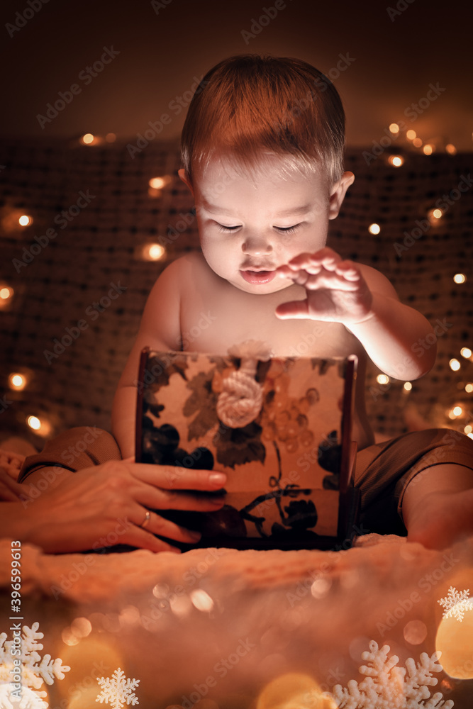 baby opening a Christmas present, bright magical light out of the box, fulfillment of wishes, dreams, believe in Santa Claus