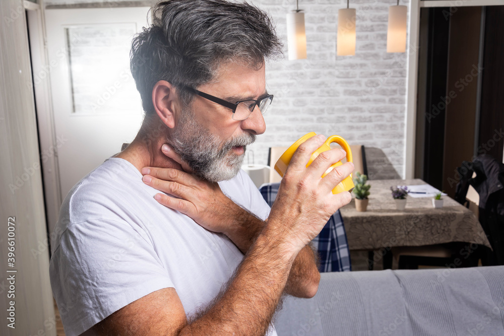 Mature man having sore throat and touching his neck. Terrible pain in his throat.