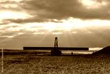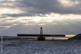 Large tube on loader. Construction Marine offshore works. Dam building, crane, barge, dredger.