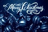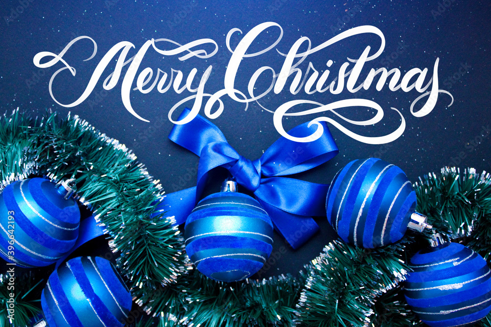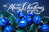 Merry Christmas hand drawn text, calligraphic lettering design card with blue balls. Holiday Greeting Gift Poster.