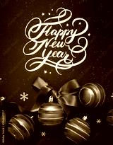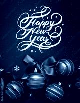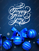 Happy New Year hand lettering on blue background with blue balls on dark blue shiny background. Greeting card.