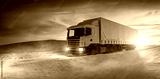 LKW in weiter Winterlandschaft bei Sonnenaufgang