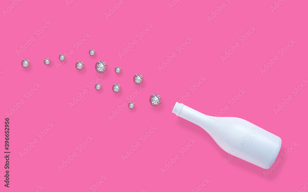 Creative Christmas and New year concept with champaign bottle and shiny disco balls on pastel pink background. Flat lay design