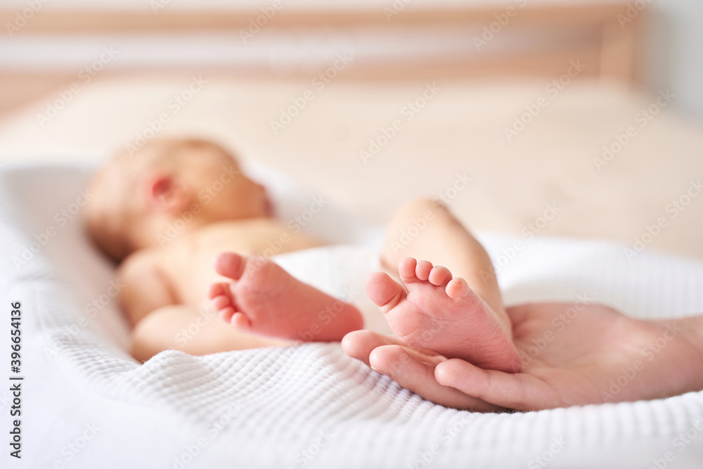 Newborn tiny legs. Sister holding little feet. Two people. Healthcare concept. Unrecognised modern parenthood. Comfort and safety sleep. Human insurance. Family miracle. No face. Banner with copyspace