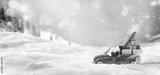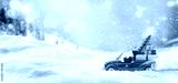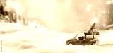 Santa Claus in Red car delivering christmas tree and gifts at snowy background. Christmas card
