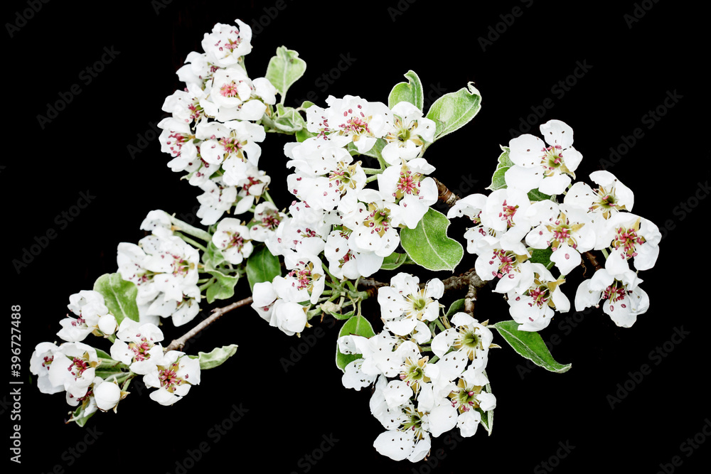 Chaenomeles speciosa flower. White blooming flower isolated on black. Studio plant background.