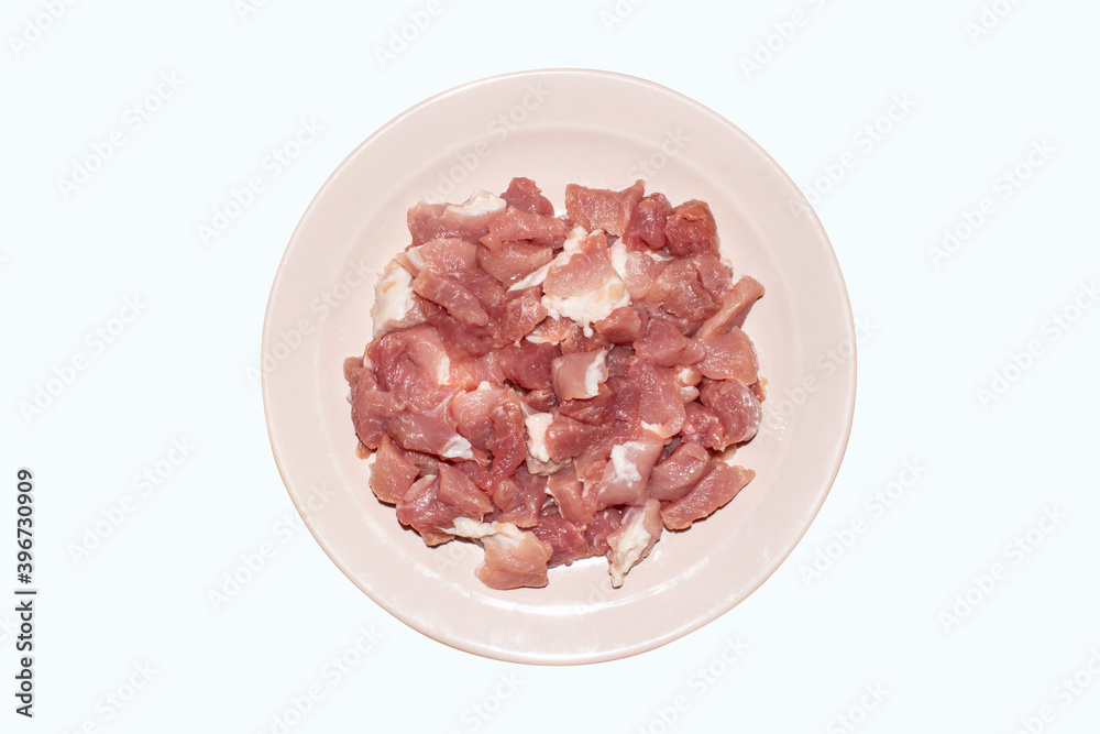 A piece of fresh pork meat on a white background.Pork tenderloin top view.