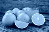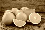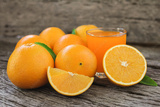 Fresh orange fruits with leaves on wooden table. Glass of Fresh Orange Juice.