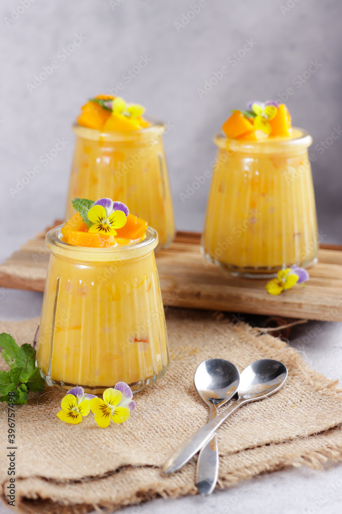 Mango sago. Sweet sago cream with mango, coconut milk and mango juice garnish with edible flower.