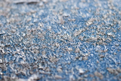 White hoar frost crystals on flat surface closeup view