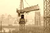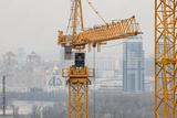 Construction cranes on the background of the left bank districts of Kyiv, Ukraine. November 2020