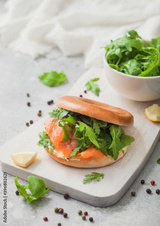 Bagel and salmon sandwich with cream cheese and wild rocket in white bowl and lemon with pepper on light background.