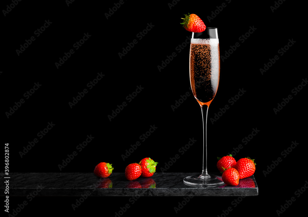 Elegant glass of pink rose champagne with strawberry on top and fresh berries on black marble board on black background. Space for text