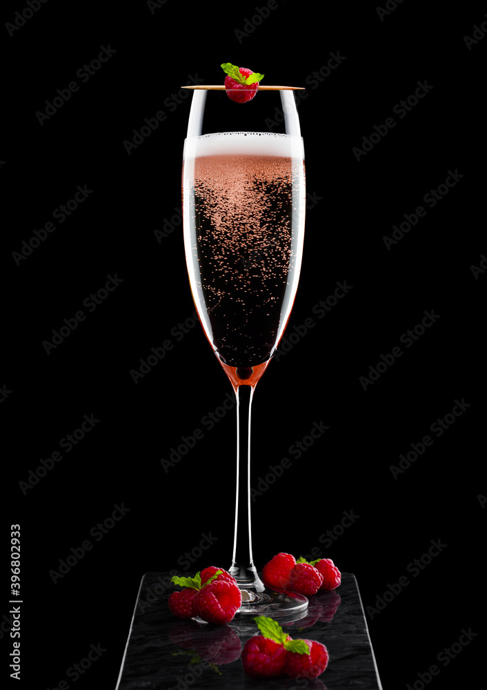 Elegant glass of pink rose champagne with raspberry on stick with fresh berries and mint leaf on black marble board on black background.