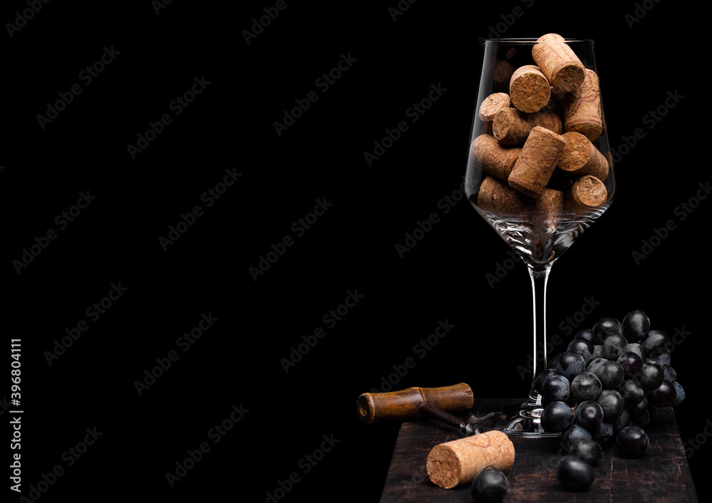 Wine glass with corks inside with vintage corkscrew opener and dark grapes on wooden board on black background. Space for text