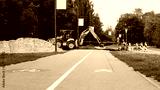 Road construction works. Asphalt road. Pedestrian and bicycle path. Yellow excavator digs ground.