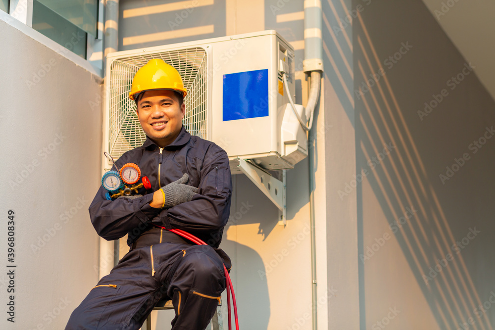 Happy asian technician is checking air conditioner, After-sales service concept