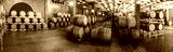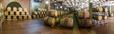 Panoramic view inside a wine cellar with Oak wine barrels full of aging red wine, stacked in a winery in the Breede Valley in the Western Cape of South Africa