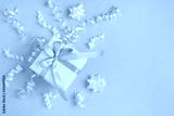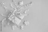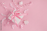 Top view of white gift box and confetti on the pink background with copy space