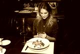 beautiful young female at the table with a glass of red wine with a mobile phone