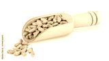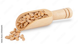 close up Spelt grain wheat in wooden scoop isolated on white background