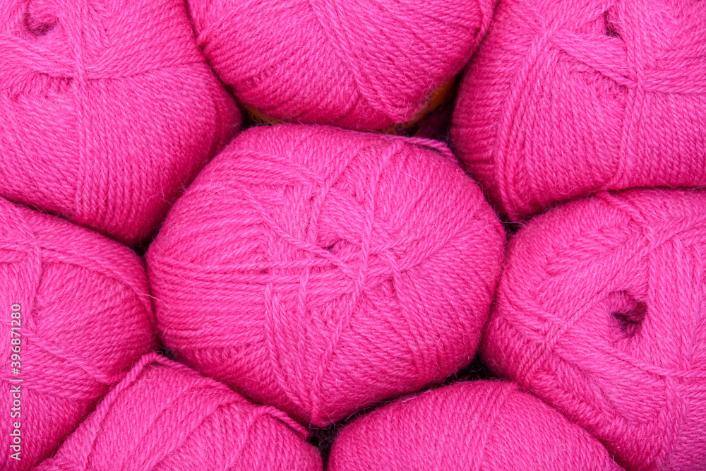 Red pink colorful skeins of yarn close up, fuchsia color woolen yarn for crochet and knitting, hobby and handmade concept