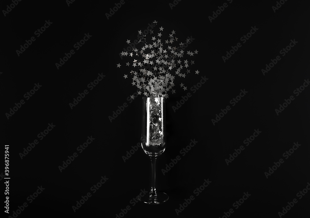 Silver star confetti poured out champagne glass in flat lay style on black background. Christmas and New Year holiday celebration concept. Copy space.