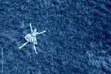 Aerial drone top view of happy smiling little girl in pink dress relaxing on green grass meadow during sunny summer day in park. Free space