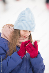 Adorable jeune fille prend des photos de selfie dans un magnifique parc d'hiver. Activités d'hiver pour les enfants.