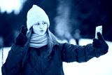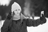 Adorable jeune fille prend des photos de selfie dans un magnifique parc d'hiver. Activités d'hiver pour les enfants.