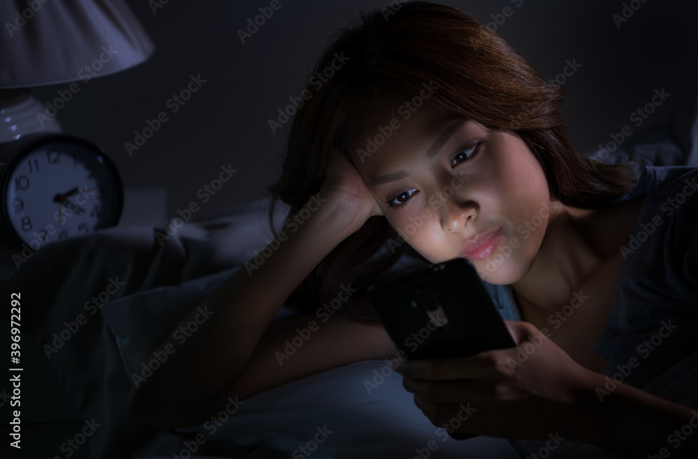 Young woman using a smartphone in her bed at night