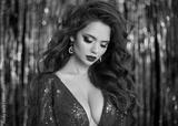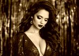 Beautiful brunette in red dress with Healthy wavy hair. Glamour Makeup. Fashion Beauty Girl Isolated on bright bokeh party Christmas Background.