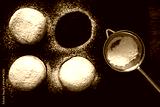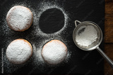 Traditional German fried donuts with no hole, so called Krapfen or "Berliner Pfannkuchen" sprinkled with powdered sugar and filled with jam or chocolate. donuts in preparation
