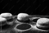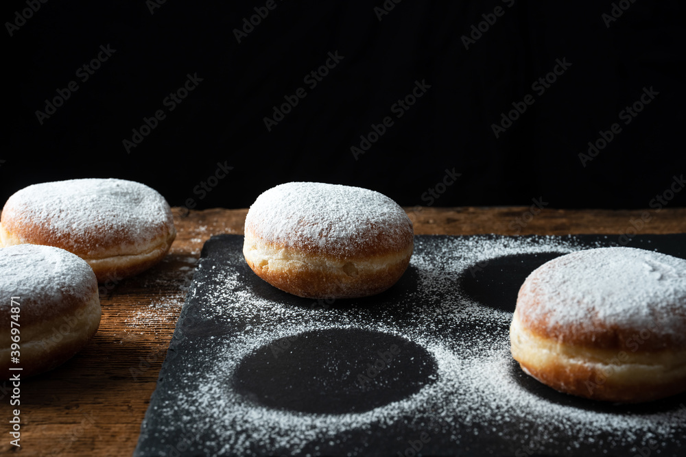 Traditional German fried donuts with no hole, so called Krapfen or "Berliner Pfannkuchen" sprinkled with powdered sugar and filled with jam or chocolate. donuts in preparation