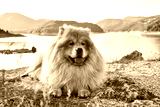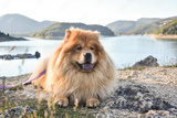 Beautiful dog chow-chow outside. Purebred dog chow chow on vacation on mountain lake Zaovine