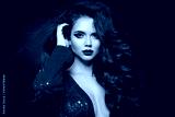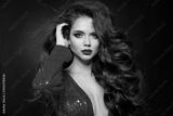 Beautiful sexy brunette in red dress with healthy curly hair and glamour makeup. Fashion Beauty Girl Isolated on black studio Background.
